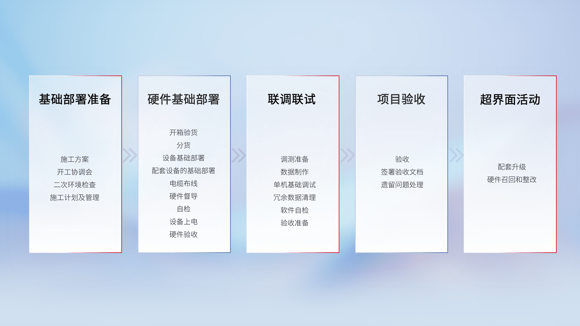 从基础部署准备、、硬件基础部署、、、、联调联试、、、、项目验收、、越界面活动的全过程可追溯,,,保证施工质量和进度。。。